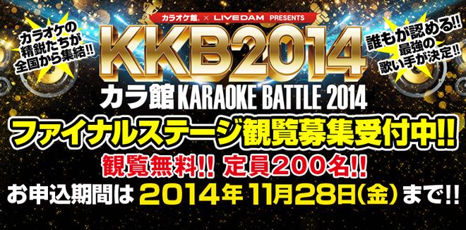 カラオケ館を運営する株式会社ビーアンドブィが開催している「KKB2014カラ館カラオケバトル 2014」のファイナルステージ観覧募集の受付が開始された。