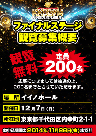 そしてこの度、12月7日(日)東京・イイノホールにて開催されるファイナルステージの観覧募集の受付をKKB2014特設サイトにて開始。いよいよ優勝賞金1,000万円のゆくえが決定するファイナルバトル。全国の一次予選、二次予選を勝ち抜いてきたカラオケの精鋭たちがついに集結する。