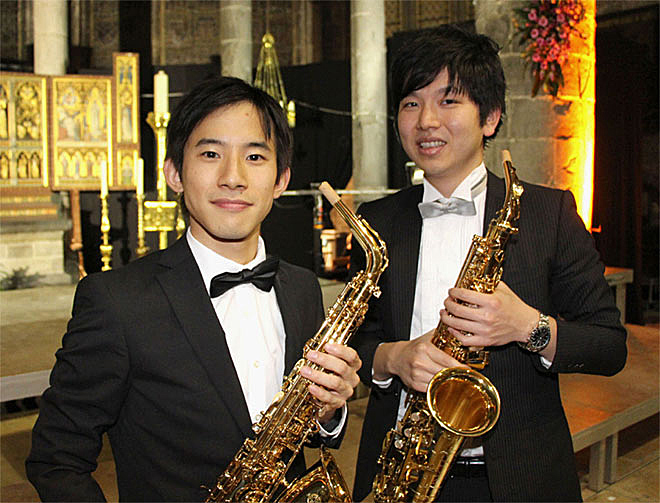 ▲第6回アドルフ・サックス国際コンクールで2位を受賞した上野耕平(左)と6位の田中拓也。(C)共同。