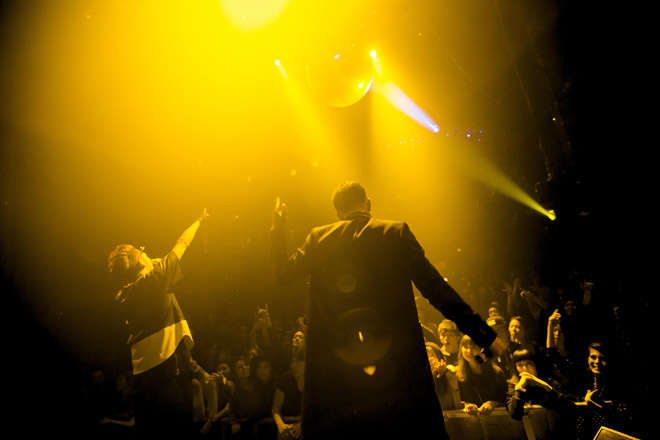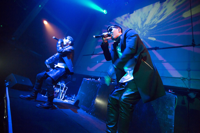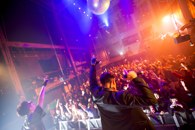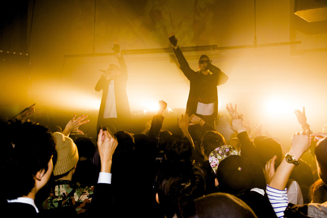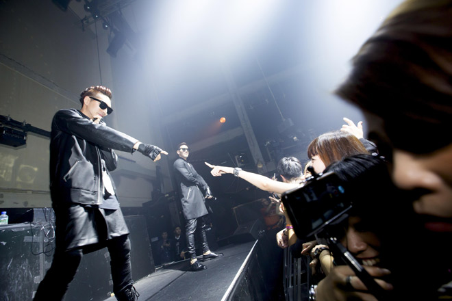 「Are you ready!?」と第一声を放ち、メジャーデビュー・ミニアルバム『TOKYO STYLE』収録曲「FUTURE PARADE」からライブがスタート。ジャケットの裾をなびかせ、オーディエンスを挑発するパフォーマンスを見せる2人。続いて「Welcome To The Party」へ。四つ打ちのリズム・トラックから、シンセのイントロ・フレーズに変わり「Let’s Sing Together!」とthisisWAYNEが叫ぶと、腕を振り上げて応えるフロアの観客たち。早くも上半身裸になり盛り上がっている外国人の姿も。サングラスを外して歌い出すthisisWAYNE。iamSHUMは額にサングラスをずらし、フロア後方まで眺めている。端正な顔立ちのイケメンコンビだけにやはり女性ファンも多いようでステージ前方に駆けつけて踊っている。