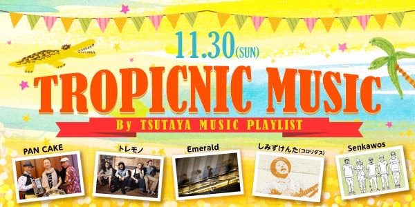 イベントのテーマは、『TROPICAL×PICNIC×MUSIC = TROPICNIC MUSIC(トロピクニック ミュージック)』。ライブには、PAN CAKE、トレモノ、Emerald(acoustic set)、しみずけんた(コロリダス)、Senkawosが出演。「TSUTAYA MUSIC PLAYLIST」の中の人たちが「みなさんにオススメしたい!」と本気で思った音楽、アーティストをセレクトしたとのこと。