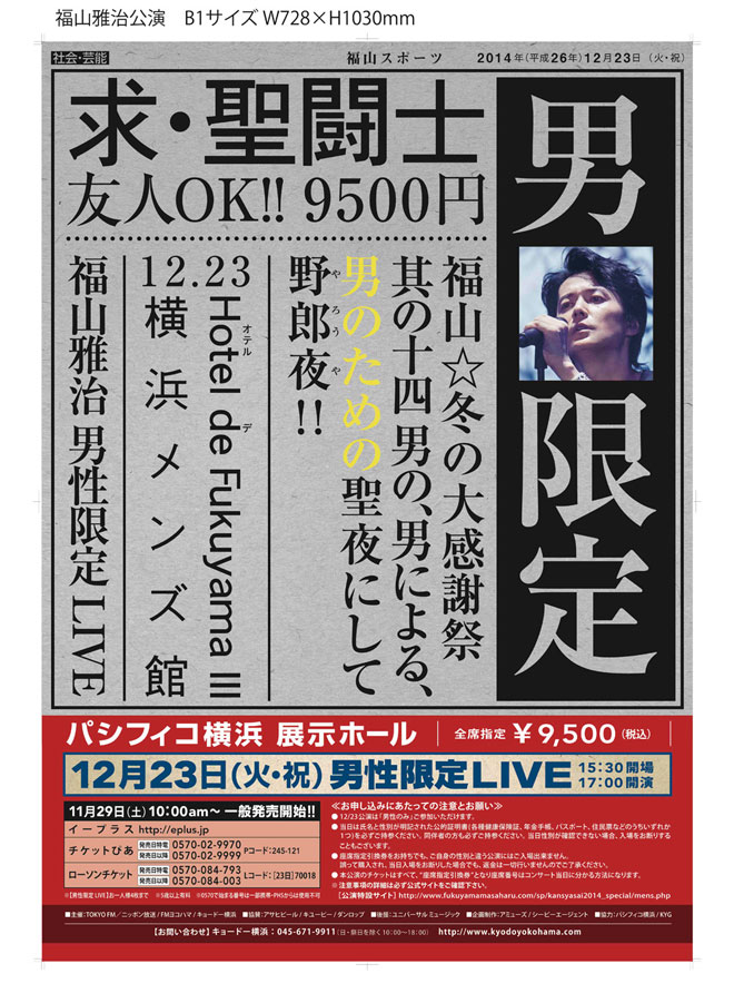 福山雅治、<福山☆冬の大感謝祭 其の十四>スタート&男性限定ライブポスター公開