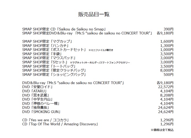 またショップのオープンと同日、12月10日に発売されるコンサートDVD&Blu-ray『Mr.S “saikou de saikou no CONCERT TOUR”』にもSmap Shop限定盤を用意。ジャケットはもちろん、32ページのブックレットやBONUS CONTENTSに収録されたSingle SelectionもSmap Shop限定の内容となる。