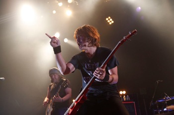 NAMBA69の30分間の全力疾走に続いてステージに現れたのは、神戸出身の4人組、アルカラ。ダーク&ヘヴィに歪んだコード感の爆音と、その音の壁を突き抜ける稲村太佑の強烈な歌声。それだけでも充分過ぎるほど強烈なのだが、その稲村のMCが観客を惹きつけて離さない。なにしろ「あの日、ロージア(もちろんLUNA SEAの「ROSIER」のことである)に出会ってロックに憧れた少年が、ここにいる」、「PYROMANIA(Jの1stアルバムのタイトルであり、彼のファンを指す言葉でもある)の皆さん、いかがお過ごしでしょうか!」といった具合に、ファン丸出しなのだ。実際、彼には、TVでLUNA SEAが演奏しているのを目にしてバンド結成を思い立ち、ギターを買うつもりが何故かベースを買ってしまったという過去があるのだという。そんな彼らが披露した離れ業は、「交差点」と題されたこの日のクロージング・チューンに、そのまま「ROSIER」の歌詞を載せて歌うというもの。フロアが“揺れて揺れて”状態に陥ったことは言うまでもない。とはいえもちろん、そうした面白さが際立つのも肝心の演奏力が確かだからこそ。今後の動向にも是非注目したいところだ。