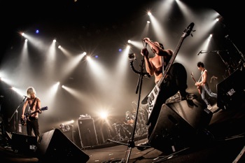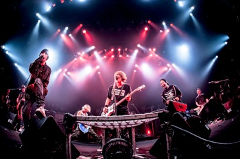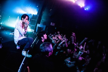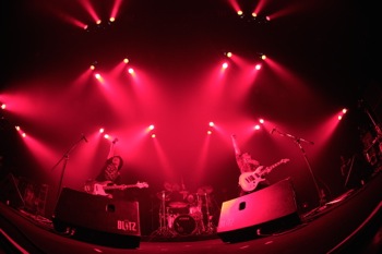 続いて登場したのは横浜界隈を拠点とする元気者トリオ、OVER ARM THROW。2007年に発表された1stフル・アルバムの1曲目に収録されていた「Thanks」で幕を開けた彼らのステージからまず感じられたのは、楽曲タイトルに引っ掛けるわけではないが、感謝と喜びの気持ちだ。曲の狭間で菊池信也(vo,g)と鈴野洋平(b)が、ほぼ交互に、LUNA SEA影響下世代ならではのエピソードを披露。「中学校の頃、スレイヴだったの」と菊池が告白したかと思えば、鈴野は「Jさんのベースを聴き始めて20年、(自分が)ベースを始めて20年になります!」と言う。彼らがそのステージ上に立っていること自体に喜びを感じているのは、その表情や口調からも明らかだったが、「この喜びをお裾分けするから。確実に伝染させるから!」という言葉にも嘘はなかった。ポジティヴでストレートな楽曲群は同時にとても表情豊かで、菊池の伸びやかなヴォーカル(MCでは、RYUICHI唱法を通じてヴィブラートを習得したとも語っていた)をはじめ、演奏ぶりも安定感十二分。これからが、実に楽しみだ。