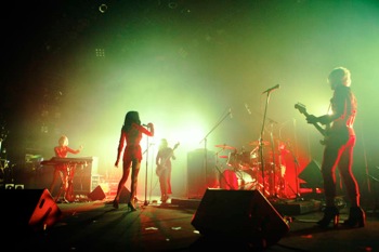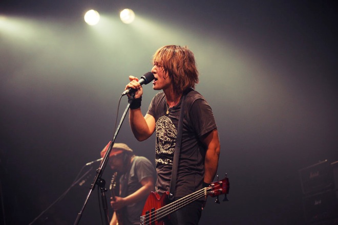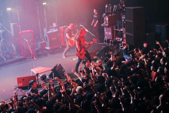 続いてステージに現れたのは[Alexandros]だ。川上洋平の「最高の夜にしようぜ!」という呼びかけに導かれて始まったのは「Stimulator」。リズムに同調したフロア前方の完全な一体感が、徐々に後方へも押し寄せてくる。ジャングル・ビート的な「Waitress,Waitress!」でフロアをさらに揺らすと、川上は甲高い声で「赤坂、暴れたおせ!」とさらに煽り、「Kick&Spin」へと雪崩れ込んでいく。