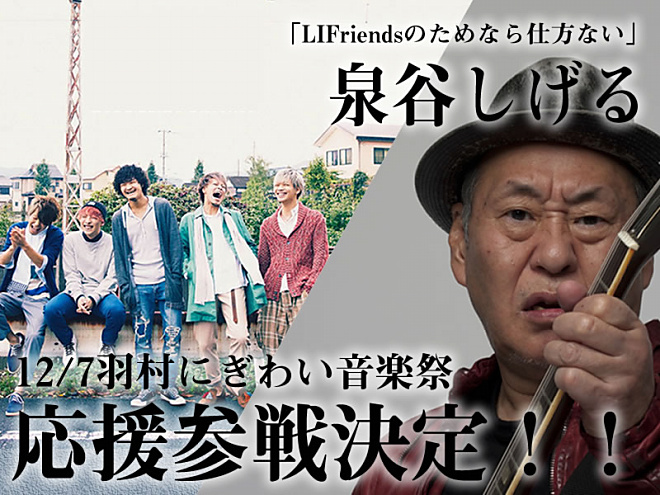 <第一回羽村にぎわい音楽祭>は、LIFriendsが現在も住み続けている羽村市と共同で開催する入場料無料のイベント。出演アーティストにはA.F.R.O、AMEMIYA、新里宏太、フラチナリズムがアナウンスされていたが、今回、泉谷しげるの出演が決定した。