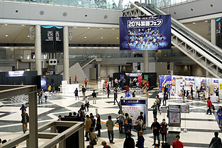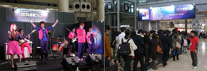 ▲展示エリアに三方を囲まれた会場外のスペース「アトリウム」。オープニングセレモニーのほか数多くのライブが繰り広げられた2つのステージに加え、音楽教室のブースや地図&イベント案内のパネルも。