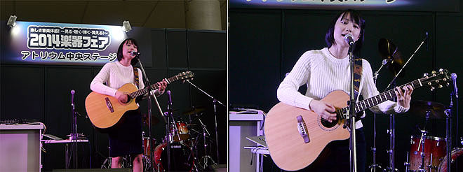 ▲初日のオープニングセレモニーには新山詩織が登場、「今日は朝早いですけど、この楽器フェアのセレモニーに出演させていただきほんとにうれしいです」と述べアコースティックギター1本で「今 ここにいる」と12月3日発売の新曲「絶対」の2曲を披露。MCでは、「今日はこの開場に120社以上の楽器メーカーが集まっているということで、楽器をやっている人には天国のようなイベントだと思います」、「私がアコギと出会えたように、今日はこの楽器フェアでこれから楽器を始めたい、興味があるっていう人には新しい出会いを見つけてもらえたらいいな」とコメント。