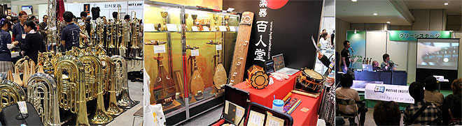 ▲楽器フェアにはバンド系はもちろん、クラシック/オーケストラ系や和楽器まで幅広いジャンルの楽器に触れることができる(左、中)。また、会場内には5つのステージが設けられ、ライブやセミナーなどが開催されている(右)。