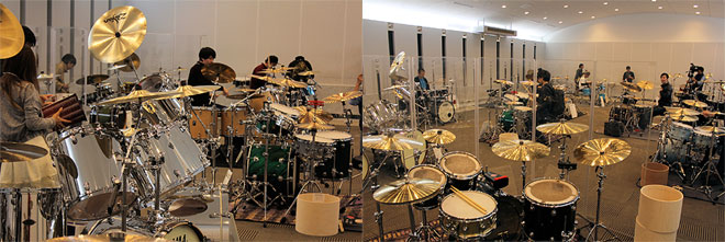 ▲国内外の有名ドラムブランド9社の今イチオシしのドラムセットを思う存分体感できるのがドラマーズ・パラダイス。500円で25分間叩きまくれる、ドラマー感涙のスペース。各社のスネア40台も同時展示。