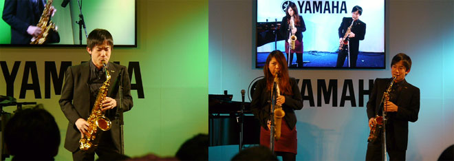 ▲各社のブースでも数多くのライブが行われた。写真は弦楽器・管楽器・アコースティック・ギターエリアのヤマハミュージックジャパンのブースで22日に行われた「JAZZ&CLASSIC SAXOPHONE‐ジャンルを超えた若き才能溢れるステージ」。アドルフ・サックス国際コンクールで2位を受賞した上野耕平さんとジャズ・サックス奏者中島あきはさんがそれぞれの演奏とコラボを披露。二人とも22歳。