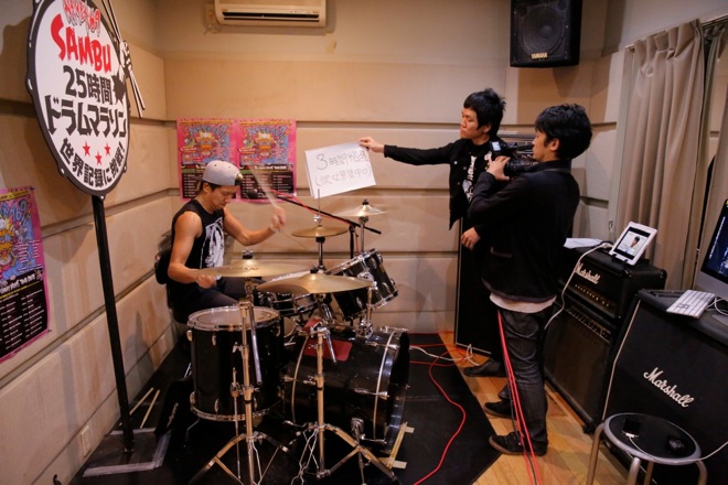この挑戦は、11月29日(土)23時半より放送された『スペースシャワーTV開局25周年特別番組 “25時間テレビ”』の企画として、当番組と並行しUSTREAMでも25時間配信された。これまで、アメリカのロックミュージシャンANDREW WKが持っていたドラムマラソン世界記録の24時間という記録を破るべく、日本ロック界を代表し、SAMBUが25時間の耐久に挑んだものだ。