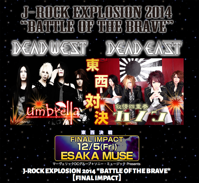 “umbrella”は、西日本サーキットツアーやコンピレーションアルバムのリリースなど、年間を通して精力的に活動してきた<DEAD WEST>、関西代表として参戦している。かたや“叙情四重奏「カノン」”は活動開始からわずか半年ながら、なみいる強豪バンドとの激闘を制して関東代表の座を勝ち取ったバンドだ。この2バンドが2014年12月5日(金)、大阪ESAKA MUSEにて<東西決戦>として真っ向勝負する。