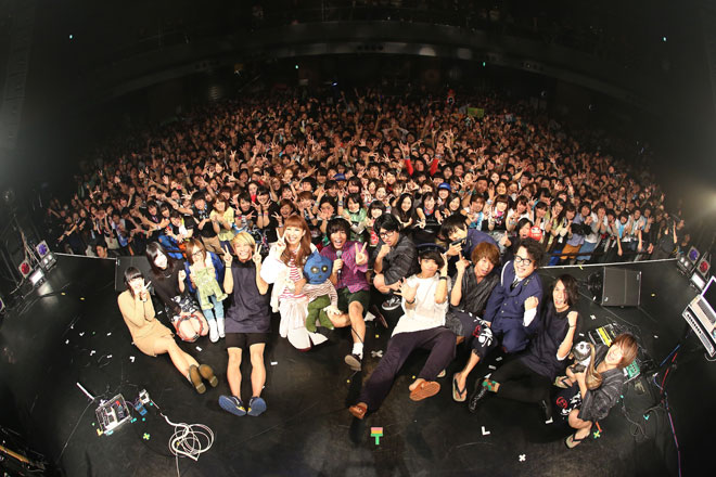 開演に先立っては、まずはサイドステージにHIP LAND MUSICが手掛けるUstream番組『夜のぶっちスタジオ』のマスコットキャラクターであるカエルの“ぶっち”が登場し、注意事項をアナウンス。さらには“元気”こと藤森元生(SAKANAMON/Vo&G)と“あきりん”こと佐藤千明(赤い公園/Vo)、さらには警官に扮した森野光晴(SAKANAMON/B)と木村浩大(SAKANAMON/Dr)が登場してのミニコントが繰り広げられ、集まった観客の笑いを誘う。