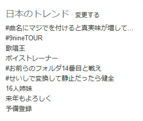 12月8日20時35分現在のTwitterトレンド(日本)に、9nineが開催している“世界同時視聴会”のハッシュタグ「#9nineTOUR」が登場し話題になっている。