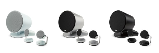 本体デザインは、継ぎ目のない滑らかなメタルの素材感やシンプルで深みのある質感など、愛着の湧く仕上がり。また、4cmフルレンジ×2のサテライト(L/R)スピーカーは各0.5kgと軽量で、据え置きとしてだけでなく、スポットライトのように壁に掛けて使用することも可能。さらに、13cmウーファーを搭載したベースユニットは大口径ながら圧迫感を感じさせないラウンドフォルムで、すっきりと設置可能だ。カラーは、明るい空間を演出するホワイトとライトブルー、テレビやパソコンなどのカラーリングとマッチするシルバーとブラックの計4色を用意する。