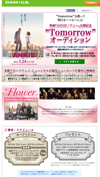 オーディションの応募期間は2014年12月1日(月)から2015年1月5日(月)。課題曲「TOMORROW~幸せの法則~」をDAM★とも動画またはDAM★とも録音曲を公開して応募するだけだ。優秀者1名は、1月20日(火)に都内で行われる映画『ANNIE/アニー』ジャパン・プレミアでFlowerと同じステージにたてるチャンスがゲットできる。