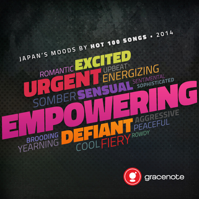 音楽ビッグデータ企業Gracenoteが、『Billboard Japan Hot 100』年間チャートにランクインした100曲を対象にムード解析したところ、2014年の「音楽のムード」は上記インフォグラフィックのようになったとか。1位は、中央に最も大きく書かれたEmpowering(勇気づける)、2位はExcited(刺激的な)、3位以降はUrgent(切迫した)、Defiant(反抗・挑戦的な)、Yearning(熱望的な)となったようだ。