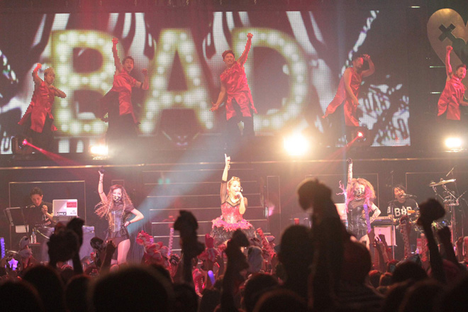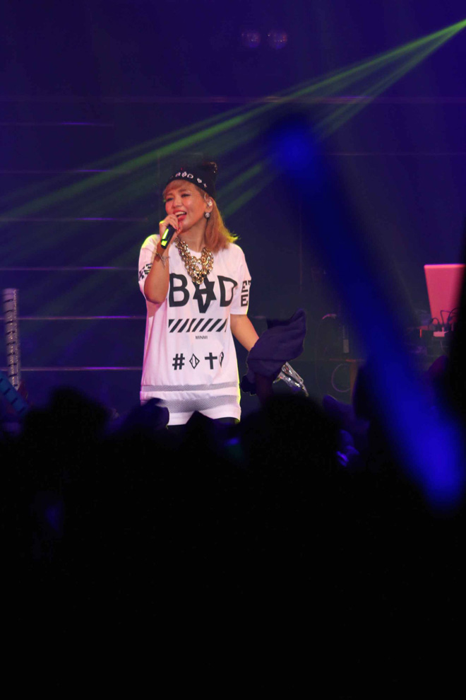 アルバムタイトル曲「BAD」のサウンドに乗って登場したMINMIは、「今日はお台場でヤッちゃいたいんです。みんな、最高の歌声を聞かせてよ」とシャウト。会場は早くも全員総立ちで大合唱となり、「ミンミー」のコール&レスポンスが勃発。いろんな演出をはさみながら、MINMIは『BAD』のナンバーを中心に歌い続けていく。「jealous」では、「東京の女の子って、なんで可愛い子が多いの?」「ジェラース」といったアドリブがポンポンと飛び出す。MINMIは「みんなもそんなん思うことあるやろ?今日はそんなストレスを発散して帰ってな」とみんなに呼びかけた。