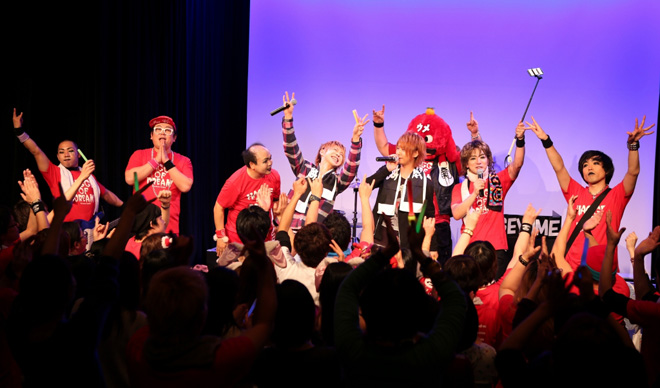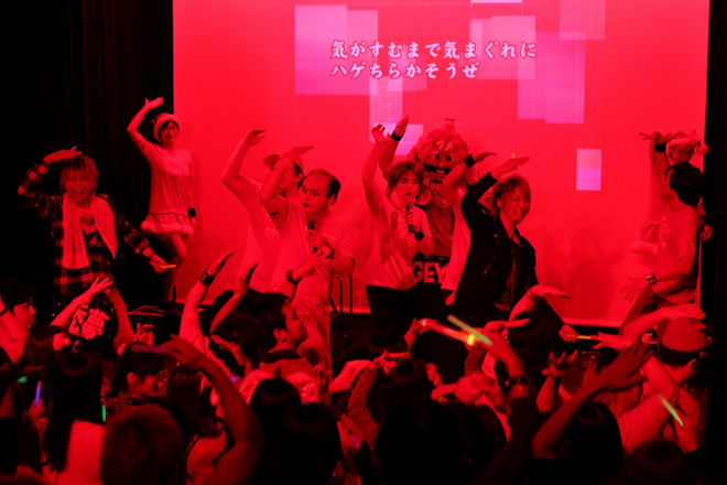 今回はこの<はまぐちコントサークル~禿夢ライブ~>にHIKARU.とKouichiが観に行っていたところを禿夢のプロデューサーであるヨシユキが見つけ、2人をステージへ。ヨシユキの「今日は見に来ていたのですか?」の問いに、ここぞとばかりにKouichiが「ちょっとお願いが…」と切り込むと、HIKARU.が渋谷公会堂で行われるカメレオ主催イベントへの出演をステージ上で突如直談判。突然のことに戸惑う禿夢メンバーに、カメレオ主催イベントの発表があった時に“禿夢は出ないのか?”という問い合わせが殺到した経緯を伝えると、ヨシユキが「行きます!」と快諾。そしてZepp DiverCity公演以来となる、禿夢のキラーチューン「リアルフォーティン」を共演し、会場を興奮と笑顔に包み込んで2人はステージを後にした。