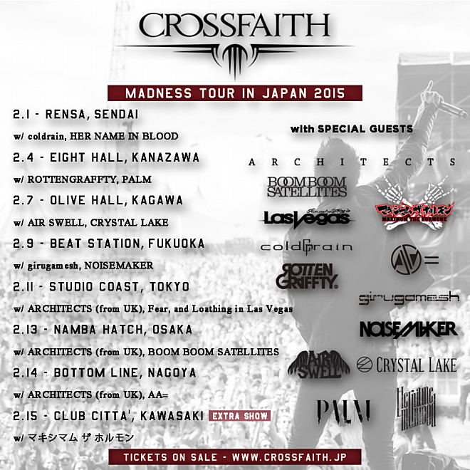 Crossfaithの全国ツアー<MADNESS TOUR in JAPAN 2015>の追加公演が、2015年2月15日に川崎CLUB CITTA’で開催されることが決定した。