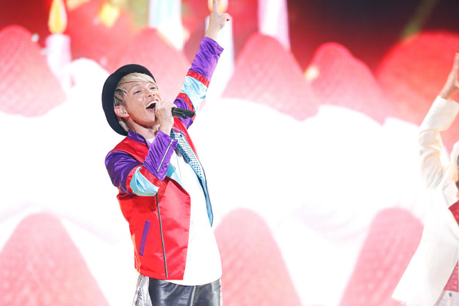 メンバーの自己紹介の後、「一人残らず笑顔にして帰します!」というko-daiの宣言から、3曲目の「LOOOP」に突入。曲中、イリュージョンのように客席のあちこちにko-daiチームとeyeronチームがダンサーと共に現れると、間近で2人の歌う姿を見た観客は大いに喜んでいた。「タノシマセ隊!!!」では、脚長ピエロや大道芸人が登場するなど、“楽しませたい度200%”の演出が炸裂。様々な芸が披露されるなか、元々ベーシストだったmattyがチョッパーベースをプレイし大歓声を浴びた。