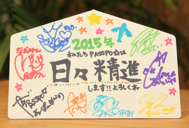 カラフルでキュートな絵馬が到着しました!1月1日の元旦フライトをもって、奥仲麻琴が卒業。2015年から“日々精進”を掲げ、新しいスタートを切ります。PASSPO☆は、その元旦フライトで、<PASSPO☆ ワンマンフライトツアー2015 ~More Attention~>を発表。3月7日(土)の千葉 柏PALOOZAからスタートします。現在、PASSPO☆モバイル 先行が実施されており、1月19日(月)までの受付。