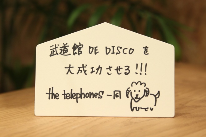 とても貴重な絵馬となりました。2015年に10周年を迎え、3月に初のオールキャリアベストをリリースし、結成記念日にあたる5月21日に初の武道館公演を開催、そして2015年以降は無期限で活動休止することを発表したthe telephones。この絵馬のポイントはきっと「大成功」させるということ。「成功」のもっと上に彼らの目標があるのだと思います。ライブハウスをディスコ化し、フェスやツアーでは各地に音楽的ミラーボールを持ち込んでみんなを踊らせてきたthe telephonesの結晶を、ぜひ武道館で拝みたいです。