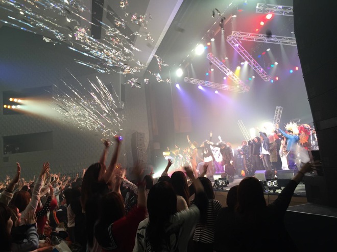 そして演奏が終わると、ステージに団長いわく「<Over The Edge>の怖い先輩」という藤田幸也、MUCCの逹瑯、Mix Speaker’s,Inc.のseekが登場。「なんでお前が仕切るの?」と団長に突っ込みまくり、その他の出演者を呼び込んで、カウントダウンを待ちながら様々なバンドのメンバーにマイクを向ける。「イケメンって、どんな気分?」と聞かれたMoranのHitomiは「甘酸っぱい感じ」とサラリと交わして、まさにイケメンな回答を。「世の中がとても回っています!」とフラフラのBugLug・燕(B)は、なぜか「妖怪ウォッチ」のジバニャン風メイクを施され、「飲み過ぎだよ!」と総突っ込みを受ける。傍らでは藤田幸也のバックを務めていたaieのジャケットを団長が無理やり着ようとして、チャックを壊す謎のパフォーマンスも。そんなドタバタの中でカウントがゼロになり、新年を祝して銀テープが飛ぶ例年通りの光景が実に微笑ましい。