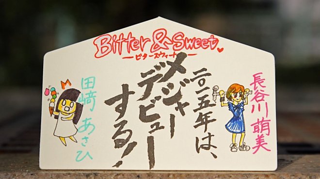 達筆で気合が入っている筆文字とメンバーそれぞれのイラストの可愛さのギャップ感がすごい。これ、結構Bitter&Sweetらしい気がします。可愛さと気合の両立。2015年のBitter&Sweetは2月11日にニューシングル「恋愛WARS/恋心」をリリース。また、4月からの音楽フェス<MUSIC FESTA>第三弾への出演が決定しています。