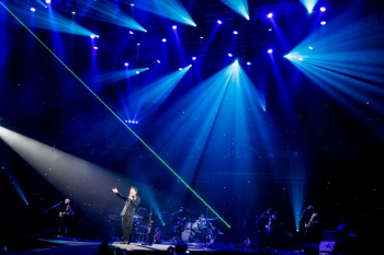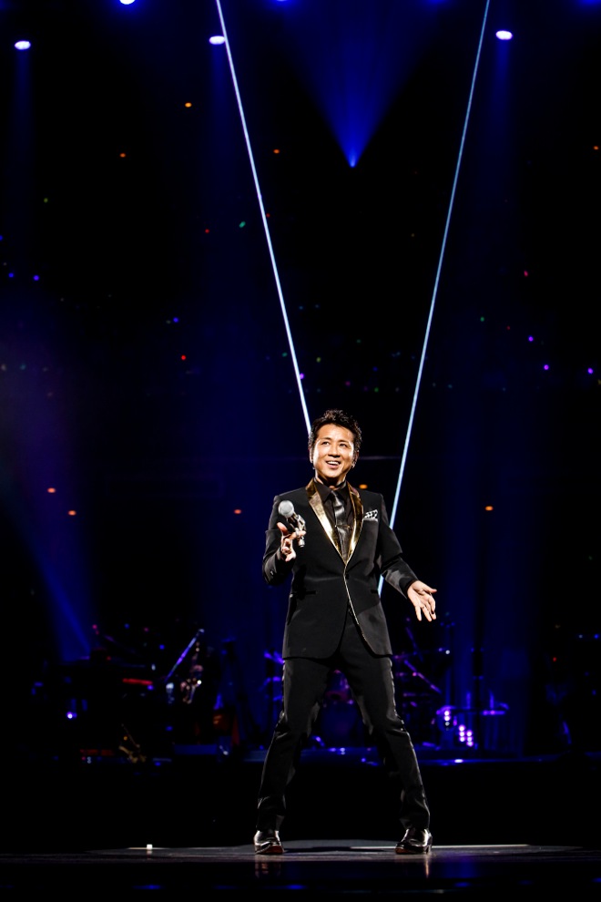 360度ファンで埋め尽くされた客席。おなじみのバンドメンバー有賀啓雄(B)、屋敷豪太(Dr)、友森昭一&石成正人(G)、松本圭司(Key)、そして弟の藤井尚之(SAX)が姿を現してイントロが始まると、ステージ中央にゴールドをあしらった黒のスーツに身を包んだ藤井フミヤが突如出現した。ライブの幕開けは人気ダンスナンバー「UPSIDE DOWN」だ。レーザー光線が飛び交う中、「“Doo-bee Doo-bee”Freedom」「MY STAR」といったオープニングを飾るにふさわしいアップテンポな楽曲で大いに沸かせる。場内は序盤からさながらダンスフロアと化した。