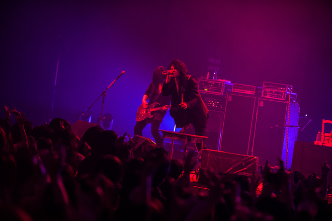 この日は開演を知らせるブザーが鳴ると、まずはステージにネロ(Ds)、結生(G)、健一(G)の3人が登場。「iNtO the mARkeT」を生演奏した後にガラが加わって「NOnsenSe MARkeT」というオープニングで、昨年発売したばかりのニュー・アルバム『NOnsenSe MARkeT』の流れをいち早く再現。その後は「ヴァニラスカイアバンギャルドへようこそ!」というガラの叫び声から「不均等キネマ」「ジャパニーズモダニスト」と,序盤から飛ばし気味にオーディエンスを熱く盛り上げた。