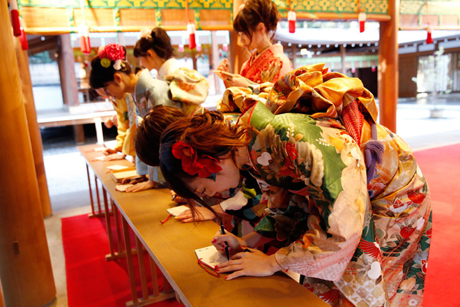 キャプテン桜井、西野を含む乃木坂46の中でも7人と一番人数の多い世代となる“華の1994年組”の成人式ということで、振袖をまとったメンバーが本殿に登場すると駆けつけた多くのファンから「おめでとう!」と祝福が飛び交い、静穏だった乃木神社は一転華やかなムードとなった。