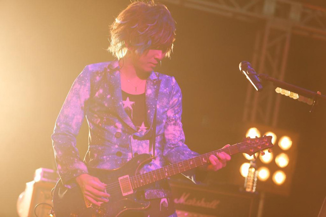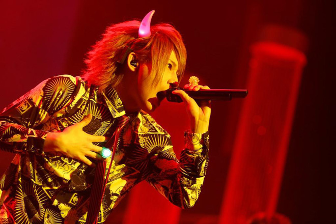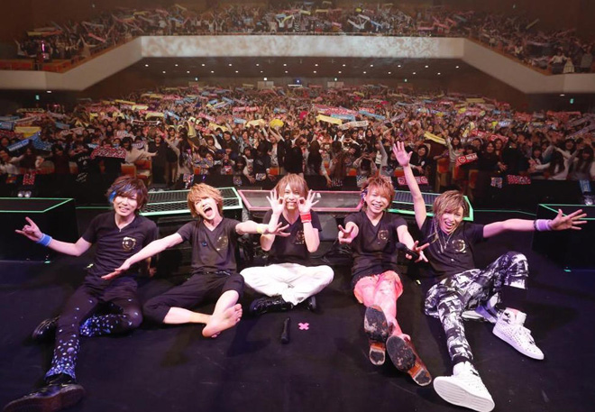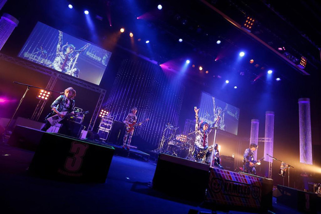 2014年のプレイバックとメンバーが意気込みを語ったコメント映像の後、ソロコーナーはHIKARU.の「Jump!!」からスタート。ドリーミーかつメルヘンなサウンドと、どことなく内省的な歌詞のギャップが印象的なこの曲を、ウサギの被り物をしたバックダンサー達がさらに拍車をかけ、より不思議な世界観を渋谷公会堂に生み出していた。続いてステージに登場したのはギターのDaisuke。ヘヴィなバンドサウンドに劣等感を打ち破りたいという想いを綴った「スマイル」で客席を熱く盛り上げると、次のTakashiは、日頃コツコツとやるのは得意だけど、思い切ったことができない自身の性格を鼓舞するダンスチューン「典型的なA型」を披露。メンバーが「いつの間に覚えた!?」と驚くほど完璧なダンスを見せつけた。そんなダンサブルなサウンドとは一転、疾走感のあるバンドサウンドで魅せたのはベースのKouichi。二度と会えなくなってしまった恋人に対し、激しい自責の念にかられる男の姿を描いた「大馬鹿者」を、マイクスタンドを握り熱唱。そして、昨年はトップバッター、今年はトリを務めるドラムのTakeshiが歌う「食べもののうた♪」へ。ヘヴィとポップを縦横無尽に行き交うハッピーチューンの途中で「タオルを回して! 手をつないで! タオルを回すだけじゃ物足りない人は頭ぶんまわせ!」と、観客を煽りに煽るTakeshi。ラストはオーディエンスだけでなく、メンバー、ダンサー全員がステージ上で肩を組んで大合唱をするという、見事なまでの大団円となった。