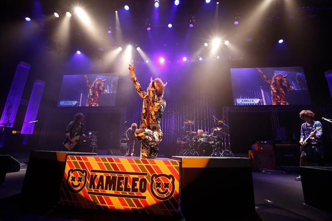 2012年の始動以降、様々な曲調を自由奔放に操りつつ、リスナーには感謝を、世知辛い世の中には毒を吐くポップでキャッチーな楽曲と、何をしでかすかまったく予想がつかないライヴで、ヴィジュアル系シーンを一気に駆け上がってきているカメレオ。中でも、バンドでありながら楽器を置き、5人全員がマイクを持って歌って踊るという、ロックバンドのお約束事を破るかのようなパフォーマンスは、観る者すべてをハッピーにさせ、多くの人々を“カメコ・カメオ化”させている(カメコ・カメオはカメレオファンの愛称)。そんな5人ボーカル曲をコンプリート、果てはメンバーのソロ楽曲までをも収録したベスト盤『5 BEST』をリリースしたばかりの彼らが、毎年恒例となっている感謝祭ライヴを行なった。結成3周年ということで、3デイズで行なわれた今年の結成記念ライヴ。その初日公演は、彼らが始動ライヴを行なった会場である池袋BlackHoleにて開催。会場定員数を大幅に上回る、文字通り桁違いの申し込みが殺到したプレミアムライヴの1週間後、2日目公演の舞台となったのは、カメレオ史上最大キャパとなる渋谷公会堂だ(尚、最終日には、同じく渋谷公会堂にて主催イベントを開催)。