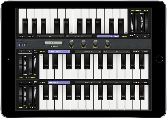 マルチプレイモードも注目だ。4パート分のPD音源に連動し、最大4段までのバーチャル鍵盤を画面にレイアウトが可能。向かい合わせのレイアウトも可能で、iPad一台で二人演奏も楽しめるようになっている。