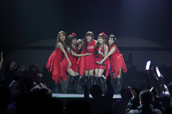 ファッションショーとプレゼント抽選会(メンバーとの写真撮影)を挟んで、「DEVILOVE」から2部のライブがスタートする。刺激的なサウンドの洪水とステージに落とされた赤い光の中で躍動するme-me*は、これまた日本では未公開の真紅のドレスという新衣装。ミステリアスな雰囲気を醸し出すダンスナンバー「mirror」とともに、しなやかに大胆に、巷のアイドルグループでは出せない本物のセクシーさを放ったパフォーマンスは、あらためて彼女たちが唯一無二の存在であることを感じさせる。