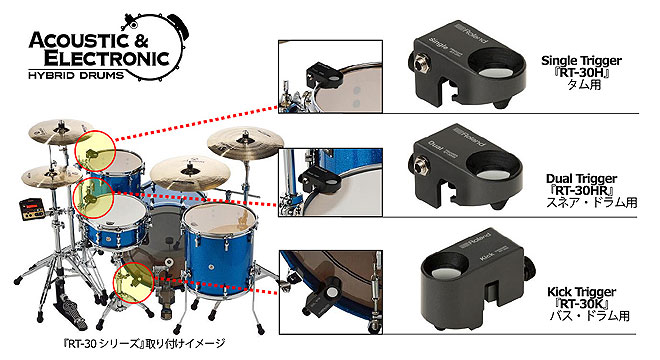 用途に合わせてバス・ドラム用「RT-30K」、スネア・ドラム用「RT-30HR」、タム用「RT-30H」の3タイプを用意する。いずれもファイバーグラス補強された頑強なABS樹脂仕様で、センサー位置を調整する必要が無く簡単に取り付け可能。持ち運びに便利な専用ケースが付属する。なお、「ハイブリッド・ドラム」には別途「TDシリーズ」などの電子ドラム音源が必要。3タイプともトリガー・モジュールTM-2やV-Drumsシリーズの音源モジュール、サンプリング・パッドSPDシリーズに対応する。