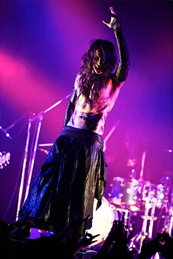 続くMEJIBRAYもアグレッシヴなサウンドと、独特の世界観を作るステージングで熱狂的な支持を得るバンドだ。彼らも2014年12月にアルバム『THE”420″THEATRICAL ROSES』をリリースしたばかり。そのアルバムの曲に、「RAVEN」や「サバト」など、おなじみの楽曲を加えたセットリストで、フロアを盛り上げていく。ヘドバンを起こす激しい曲の中に、切ないサビメロを入れ込んでいるのも彼ららしい。艶っぽい声とグロウルを使い分ける綴(Vo)を中心に、バンドの勢いを実証した。