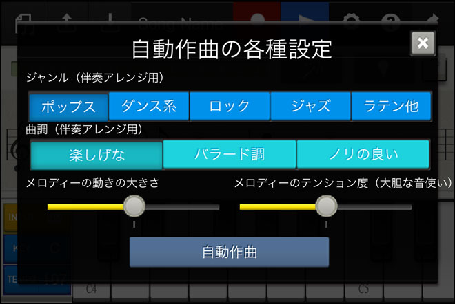 ▲自動作曲の設定。ジャンルと曲調のほか、メロディの動きの大きさ、テンション度(大胆な音使い)といった設定も。