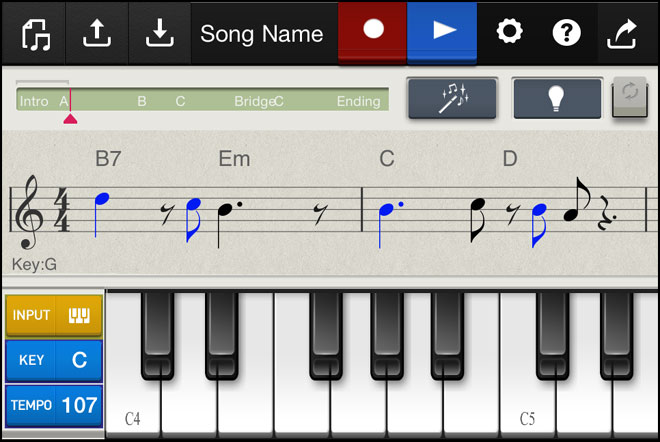 楽器が得意な人ならモチーフの入力は画面上の鍵盤でリアルタイムレコーディングすることも可能。さらに五線譜に音符を配置する方法も選択できる。コードに合う音、テンション度合いをあげる音など音符を5種類に色分けする「ヒント機能」を活用した修正も行えるなど、楽器・作曲入門者にうれしい機能も用意されている。できあがった曲を楽器練習のバッキングに使うのもいいだろう。