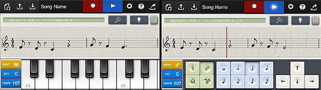 ▲メロディはマイク入力のほか、鍵盤(画面左)、音符で(右)の入力が選択可能。ユーザーの経験に合わせて3種類の入力方法が選択できる。