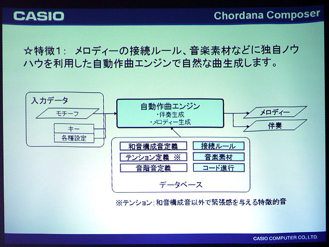 ▲説明会では、メロディの接続ルール、音楽素材などに独自のノウハウを利用した自動作曲エンジンで自然な曲を生成すると解説。確かにできあがった曲は入力したモチーフを自然に曲に仕上げてくれる。