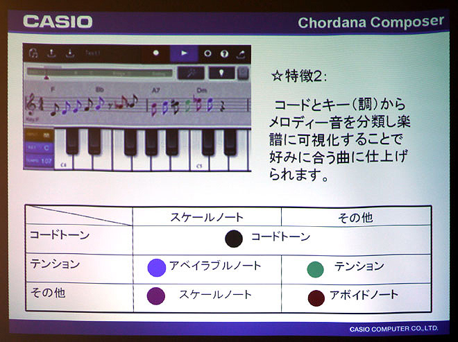 また、「Chordana Composer」については、社内公募を行い社員自らが設計を行っていることなども紹介。楽器未経験者がコード演奏の楽しみを味わえる「Chordana Tap」、楽器演奏者がコード解析ツールとして使える「Chordana Viewr」など、Chordanaシリーズに共通するChord Analysis(コード・アナリシス)の解析技術を進化させていくとも語られた。