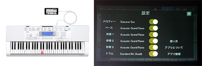 ▲MIDI鍵盤を接続して楽しむことも可能。光ナビゲーションキーボードなら光でメロディをガイド。右はパートごとの楽器音の選択画面。GM128音色から選べる。