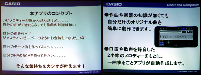 カシオ計算機は、思いついた2小節のメロディをもとに、1曲まるごと自動作曲するiPhone用アプリ「Chordana Composer(コーダナ コンポーザー)」をApp Storeで発売した。