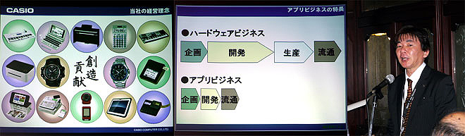 ▲カシオ計算機コンシューマー事業部の石田伸二郎企画部長が、カシオの経営理念は「創造貢献」、アプリビジネスはハードウェアビジネスと比較して短期間でアイディアを形にできることなどを説明。