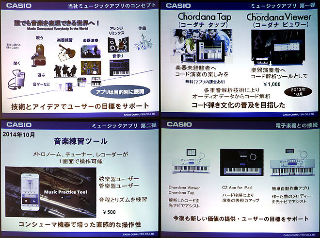 ▲カシオのミュージックアプリのコンセプトは「技術とアイディアでユーザーの目標をサポート」することと説明。アプリは目的別に展開していく。ミュージックアプリ第一弾の「Chordana Tap」「Chordana Viewer」、第二弾の「音楽練習ツール」(メトロノーム、チューナー、レコーダーを搭載)、第三弾「CZ App for iPad」などについても。