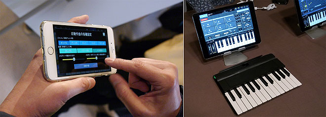 ▲説明会終了後の展示機にははすぐにでも作曲を試したい人でいっぱい。本当に一瞬で曲ができあがることを皆が実感。写真右のCZ App for iPadは、MIDI over Bluetooth LE対応のワイヤレス鍵盤MISELU C.24 Keyuboardとともに展示。